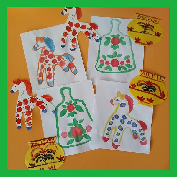 Ребята с интересом рассматривали узоры золотой Хохломы, и сказочной Гжели, дымковские игрушки и жостовские букеты. В процессе продуктивной деятельности дети рисовали орнамент, старательно прорисовывая каждый завиток. Мы думаем, что такие мероприятия расширяют кругозор детей, прививают им интерес к культуре и традициям нашей страны.