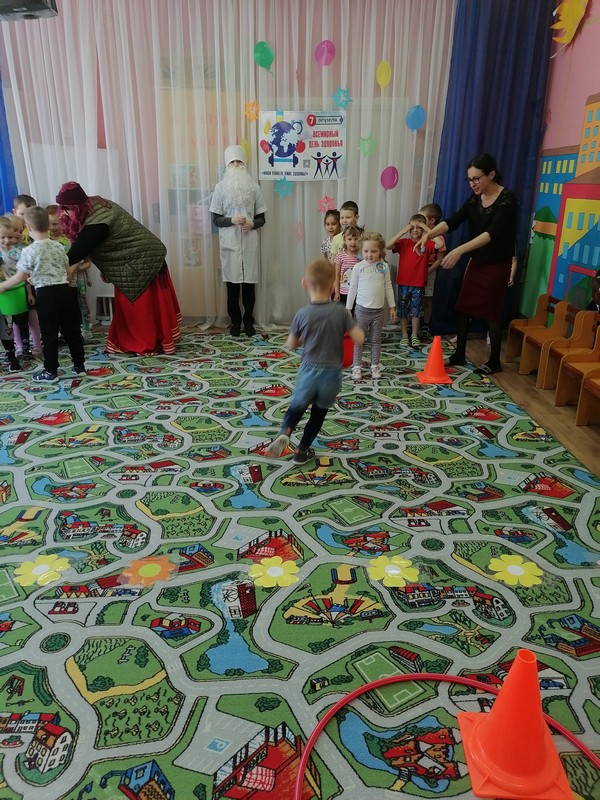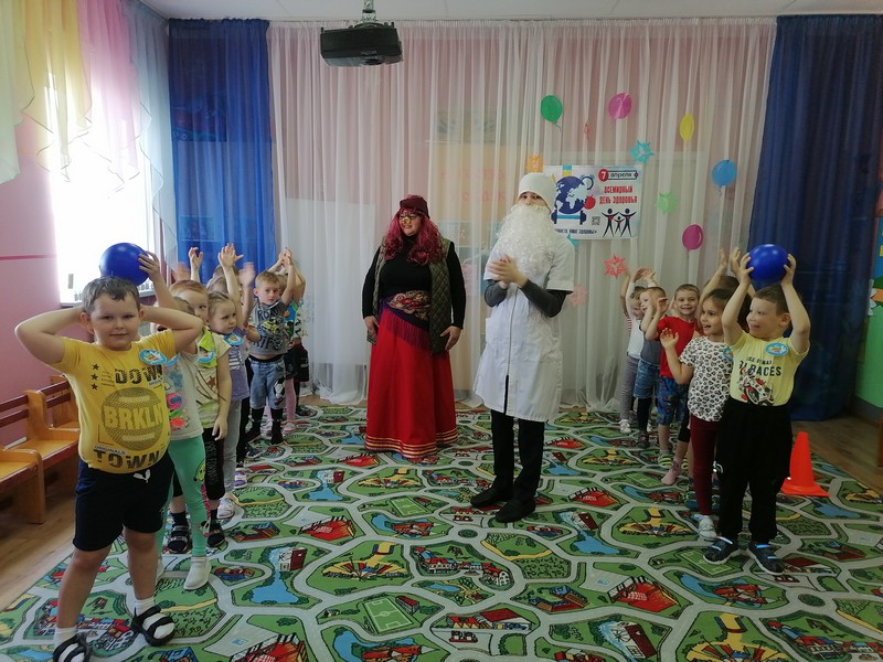 В течение дня с детьми провели беседы и посмотрели презентацию о здоровом образе жизни, о пользе овощей и фруктов, о полезной и вредной еде, играли в подвижные игры. Итогом стал праздник "День здоровья" В празднике приняли участие дети средней и старшей группы. Для детей это всегда радостное и интересное событие. В гости к ним пришли сказочные герои: Доктор Айболит и Баба- Яга. Дети соревновались в ловкости и силе. Рассказали Бабе-Яге, как вести здоровый образ жизни. Праздник получился ярким. Дети получили заряд бодрости и хорошее настроение на весь день.
