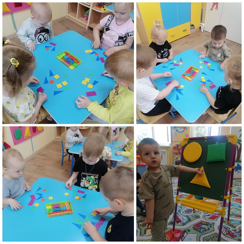 В младшей разновозрастной группе прошёл тематический день "В мире геометрических фигур". Малыши познакомились с названием геометрических фигур: "круг", "треугольник", "квадрат".