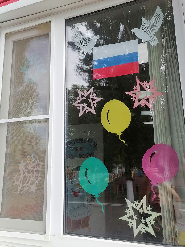 Мы оформили окна надписями, картинками с голубями, шарами и символикой нашей страны. Украшение окон - это не только интересно, увлекательно и красиво, это создаёт атмосферу одного из самых важных праздников в России.