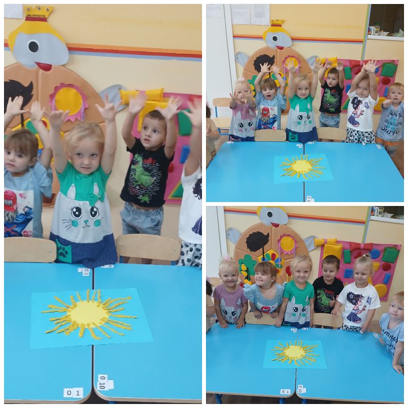 Пластилиновые лето в младшей группе. В этот день ребята с удовольствием слушали песенки и стихи про лето, создавая коллективную работу "Веселое солнышко".
