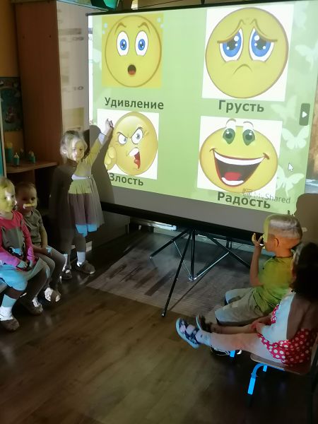 В ходе занятия: провела беседу с ребятами о том,как можно распознать эмоции по выражению лица.Детям было предложено узнать настроение смайликов (радость?,печаль?,удивление?, злость?)