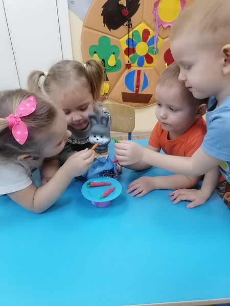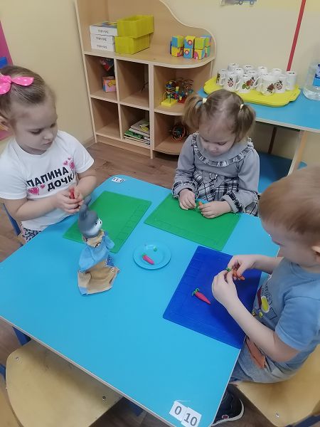 Морковка для зайчика (лепка). Подвижная игра: «Зайка серенький сидит». Цель: познакомить детей с содержанием стихотворения, развивать память; закреплять умение раскатывать пластилин между ладонями, различать цвета, любоваться готовым изделием .