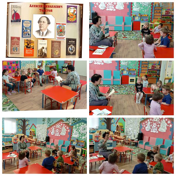 В этот день мы пригласили библиотекаря Раису Васильевну. Она очень позновательно провела беседу с детьми, рассказала биографию А. Н. Толстого и одну замечательную сказку "Золотой ключик, или приключения Буратино". В завершении провели викторину. Детям очень понравилось.