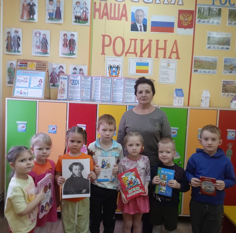 В детском саду "Буратино" в средней разновозрастной группе "Облачко" прошёл тематический день, посвящённый памяти великого поэта «В память об А. С. Пушкине». Воспитанники детского сада окунулись в мир пушкинских сказок. Ребята вспомнили любимые сказки автора: «Сказка о золотом петушке», «Сказка о царе Салтане…», «Сказка о мёртвой царевне и о семи богатырях», «Сказка о попе и о работнике его Балде», «Сказка о рыбаке и рыбке».
