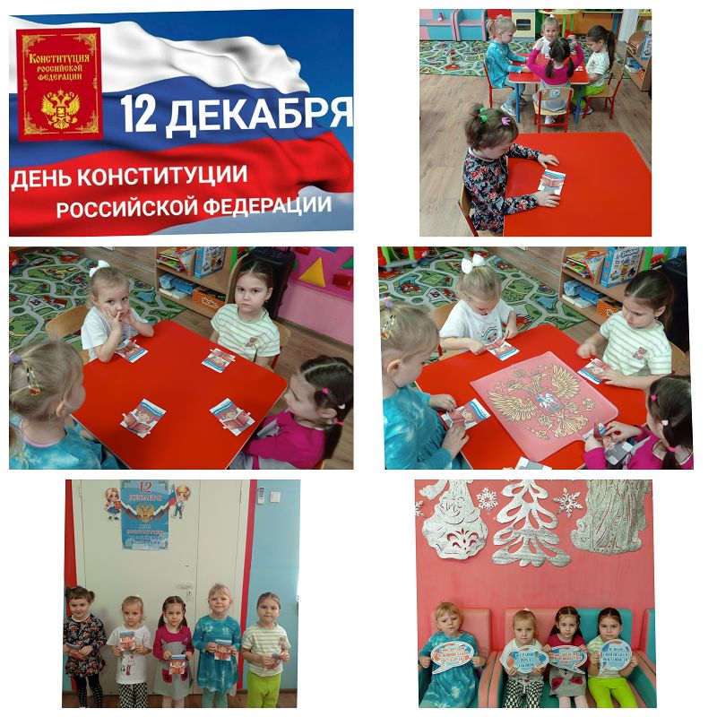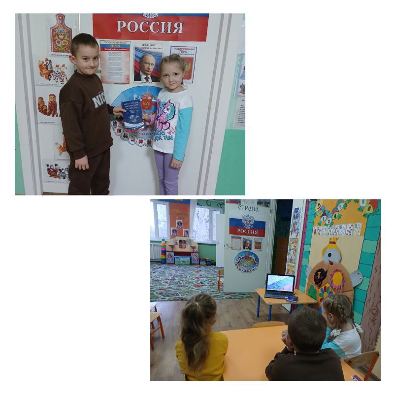 ?Познакомили малышей с понятием о том, что такое Конституция, рассказали, что это самый главный закон страны, в котором описаны все права и обязанности граждан страны. Его обязаны соблюдать все и Президент страны, и взрослые и дети. А мы все граждане особой страны, самой большой в мире, самой сильной и отважной. И, конечно, же, для нас страна Россия - это наша Родина.